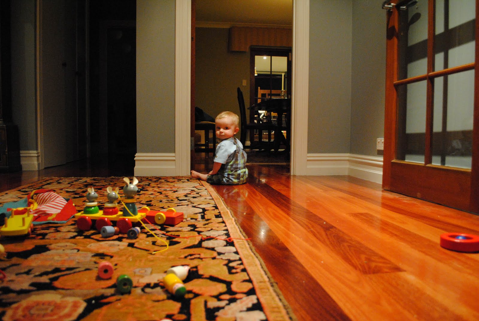 Before that there was the hall floor to explore. That was a thrill, especially because of the toys that magically appeared from a big box!